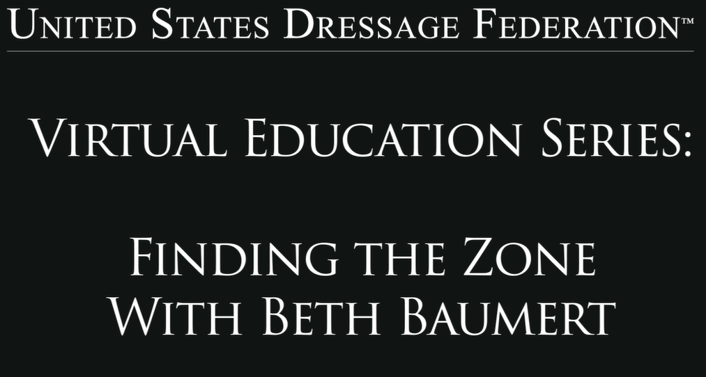 USDF Certified Instructor and bestselling author Beth Baumert as she explores "Finding the Zone" with your horse, based off of her new book. Beth will describe how to get into the "non-thinking place" where the best communication between horse and rider takes place. Learn new concepts and take a look at the physical prerequisites and mental attitudes to optimize harmony.This video is available On Demand from the USDF Virtual Education Series presented in August 2021.